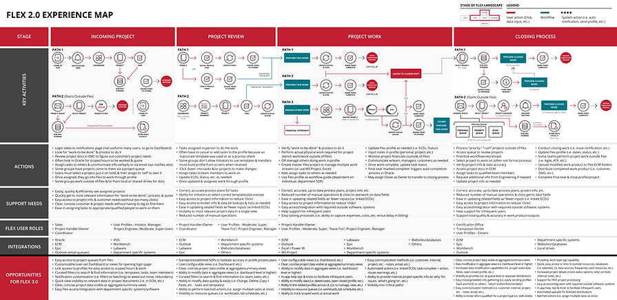As an output of discovery research, I created high-level maps of the current Flex 2 user experience to easily understand the current activities, actions, support needs, user roles, integrations and future opportunities for Flex 3.